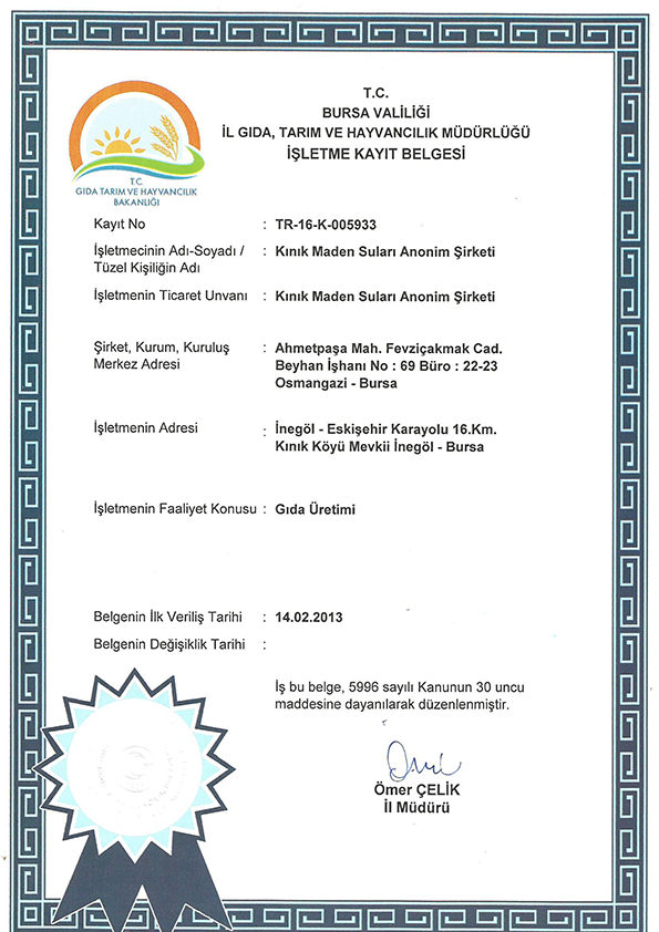 Kadim kurum kültürünü, uluslararası kalite ve yönetim standartlarına göre gerçekleştirdiği AR-GE, üretim, satış ve dağıtım çalışmalarını ile sağlamlaştıran Kınık, ISO 9001 Kalite Yönetim Sistemi ve ISO 22000 Gıda Güvenliği Yönetim Sistemi (HACCP) belgelerine sahip bulunuyor.